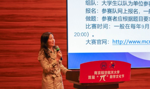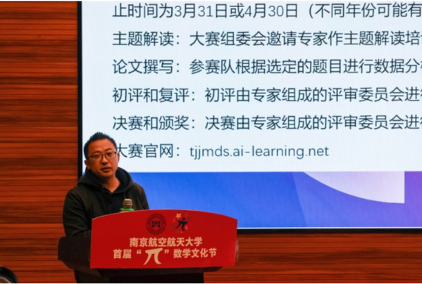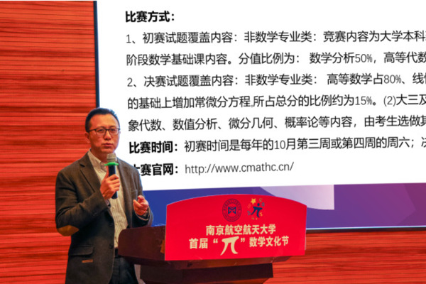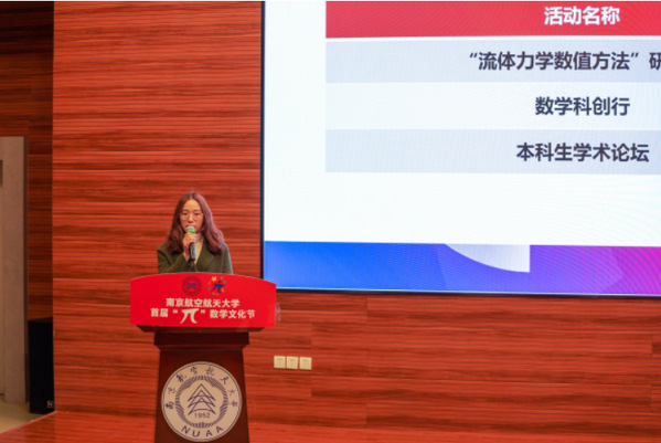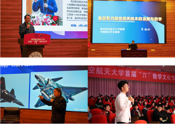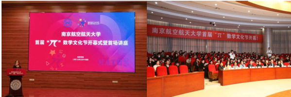 3月14日,数学学院于一号楼四楼报告厅举办南京航空航天大学首届“π”数学文化节开幕式,庆祝“国际数学日”,献礼学院成立一周年。国家级教学名师、航空学院教授昂海松、校团委副书记赵铮,数学学院党委书记许静、院长王春武、副书记周佼佼、副院长徐江、院长助理龚跃政、各竞赛指导教师、辅导员以及近300名学生参加活动。