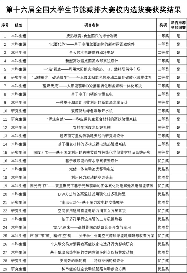 经过3个小时的激战,本次比赛共角逐出一等奖2项、二等奖5项、三等奖8项、优胜奖14项。本届校赛的29支队伍将在老师的指导下继续参加江苏省大学生节能减排社会实践与科技竞赛,决出的15支一、二、三等奖团队将被推荐参加第十六届全国大学生节能减排社会实践与科技竞赛。