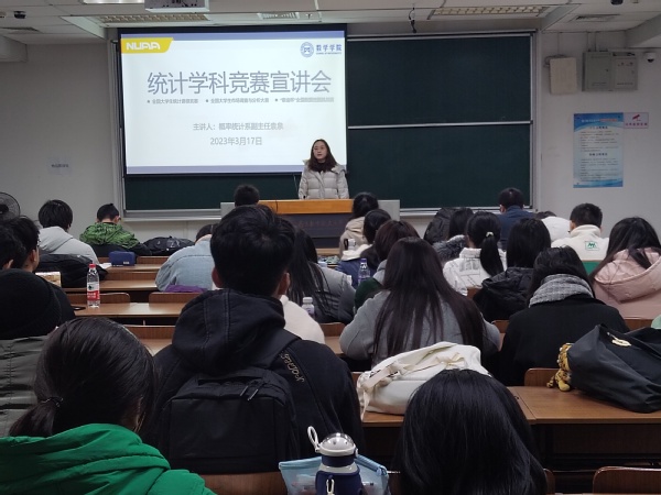 为促进学生对知识的理解与运用,营造浓厚的竞赛氛围,3月17日中午,数学学院于一号楼10109教室举行全国大学生统计建模大赛、大学生市场调查与分析大赛、“泰迪杯”全国数据挖掘挑战赛等三项竞赛宣讲会。概率统计系副主任袁泉主讲,团委书记戚月主持,全校各学院百余位同学参加。