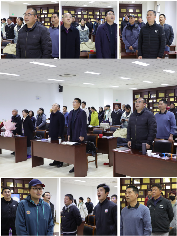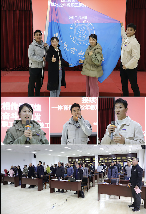 苏娟给新教师交接南航校旗,寓意将南航的体育精神传接给部门新一代青年教师。每位新教师分别发表了初入南航的感言,让大家看到了蓬勃生机的南航体育部新血液。在此,全体教师起立,合唱南航校歌《志在长空牧群星》,用南航优良的校风、教风、学风,将大家凝聚在一起。