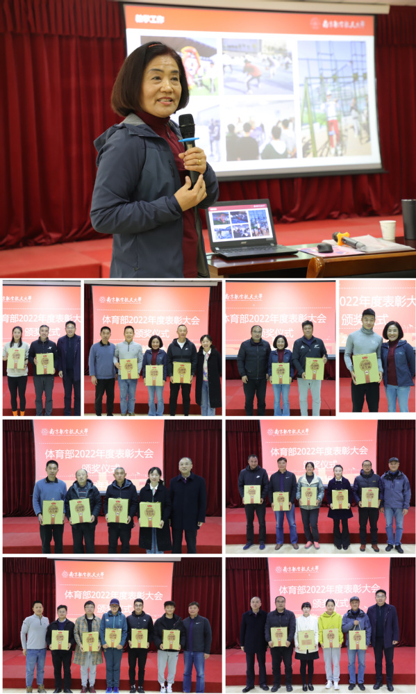 随后,进行2022年度表彰大会。陈建杰用图文结合的形式汇报展现了部门2022年在教学、群体、竞训、科研各个方面取得的重大成果。表彰仪式共颁出校级荣誉获得者、校级年度考核优秀、校级工会优秀、校级廉洁文化作品优秀奖、南京市优秀体育教师、体育部先进模范、岗位奉献奖、体育部先进个人等在内的八个奖项,获奖教师共计42人。