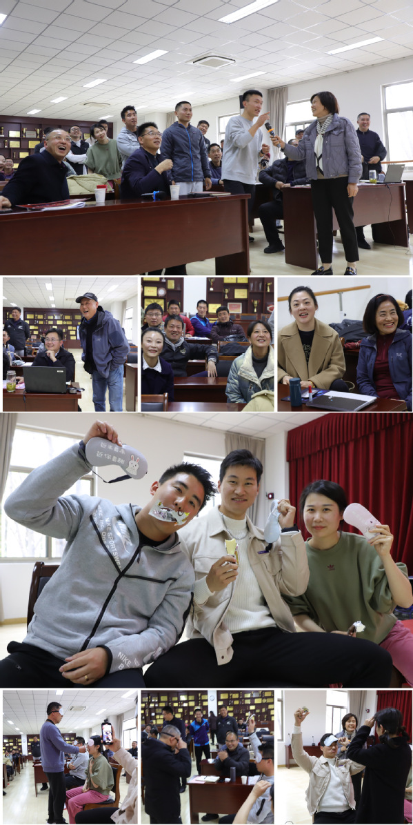 随后,体育部工会主席贺军萍带领3位新入职的教师和7位天目湖的年轻教师开展互动环节,让整个会场氛围达到了最高点。年轻教师们通过认部门老师们的照片,进一步增进了彼此的感情。华学好、苏娟、张庭发3位荣休老师蒙上眼罩给3位新入职老师吃巧克力,寓意让每位到体育部的老师都能生活甜蜜,融入体育大家庭。