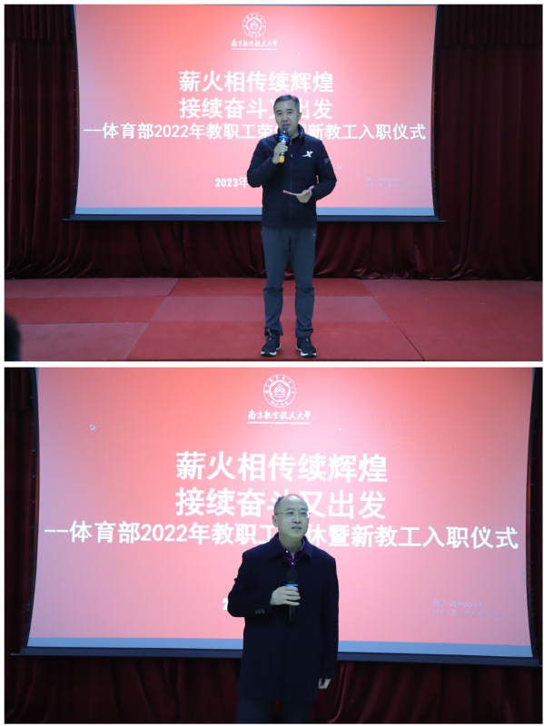 仪式伊始,袁贵平书记致辞。袁贵平将荣休教师与新教师的名字融古贯今,融入体育部欣欣向荣、蓬勃发展的美好寓意之中。他说,正是因为体育部拥有一支师德高尚、业务精湛、不断壮大的教职工队伍,才能在征途上行稳致远。