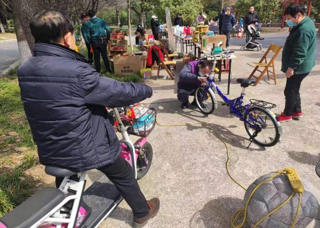 修车与食品优惠便民展销 师生志愿者合影