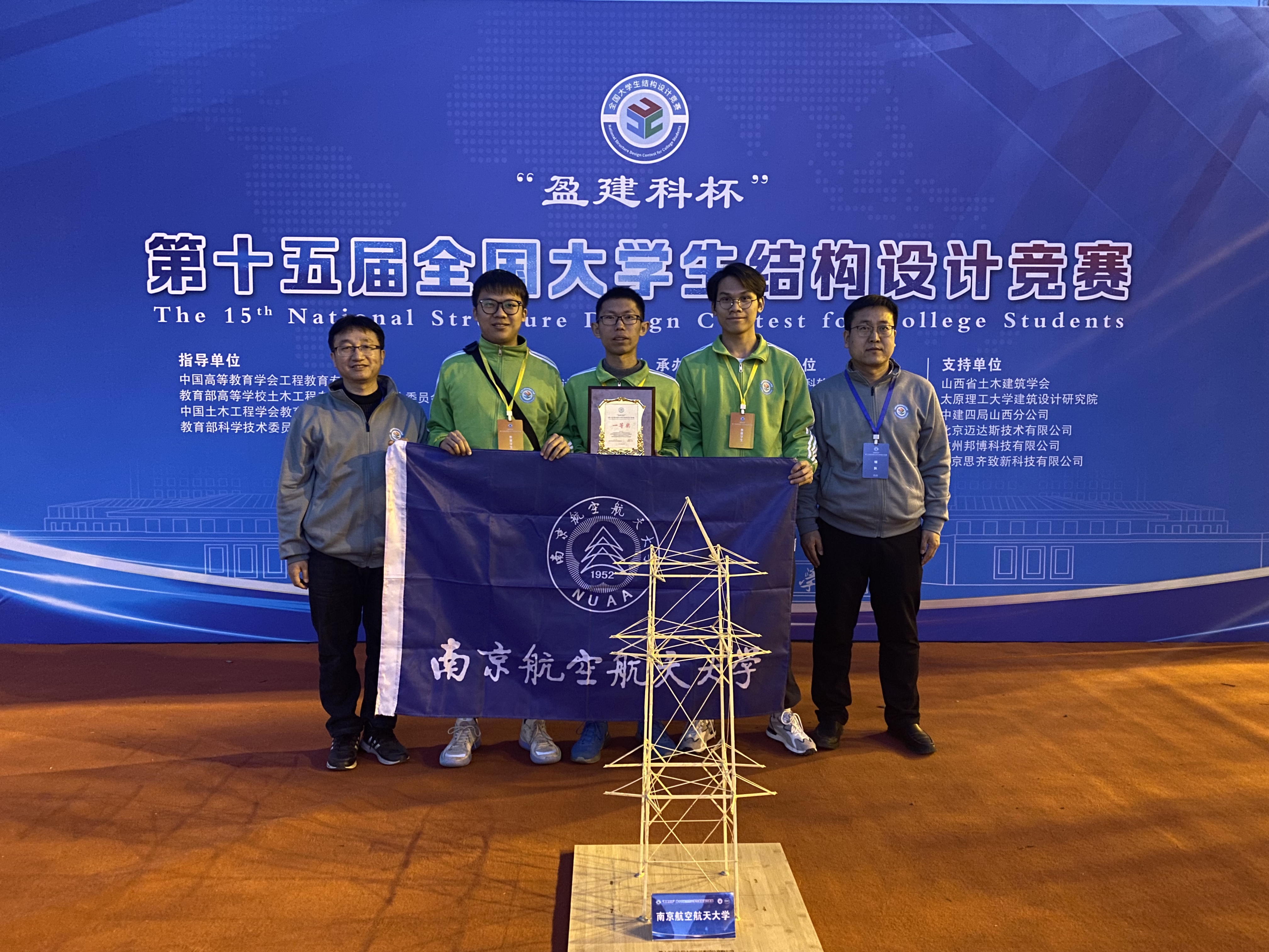 2023年3月22至26日,第十五届全国大学生结构设计竞赛在太原理工大学举行。由我校民航学院陈康泽、毛嘉辉、邱梓杰3名同学组成的代表队,在唐敢、王法武、程晔老师3位老师的指导和带领下,历经16小时现场模型制作以及陈述答辩、模型加载等环节的激烈比拼,最终排名第19,获得一等奖,实现历史性突破。