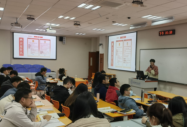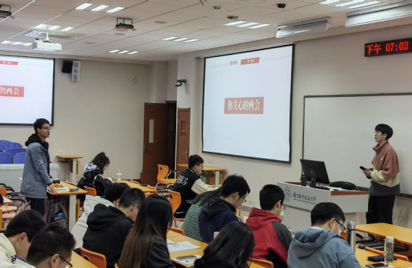 首先,党员曲玉垒领学习近平总书记在“两会”期间参加江苏代表团审议时发表的重要讲话精神,并介绍了在过去五年中,我们国家在以习近平同志为核心的党中央坚强领导下,如期打赢脱贫攻坚战,如期全面建成小康社会,实现第一个百年奋斗目标取得的伟大历史性成就。随后,曲玉垒以“你关心的两会”为话题进行分享交流,同学们结合两会热点与自身的学习成长经历,从多个方面发表了感想。
