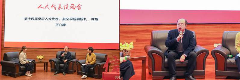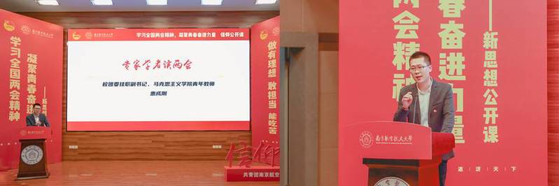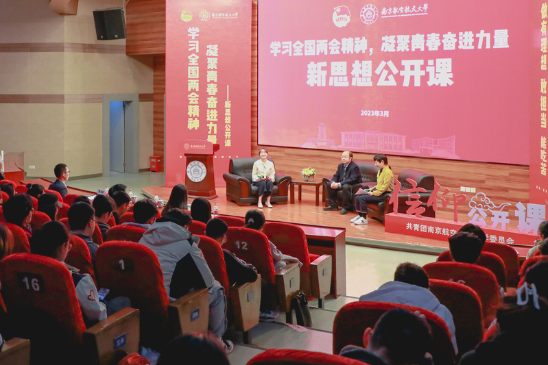3月28日,由校团委主办,航空学院团委承办的“学习全国两会精神,凝聚青春奋进力量”信仰公开课在将军路校区一号楼四楼报告厅举行。第十四届全国人大代表、航空学院副院长、教授王立峰,江苏代表团随团记者、江苏广电总台融媒体新闻二部协同协作部副主任丁凤云,校团委挂职副书记、马克思主义学院青年教师惠成刚主讲本次信仰公开课,300余名团员青年参与活动。