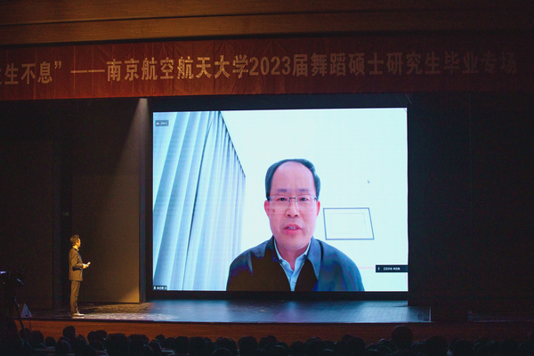 单忠德通过视频连线送来祝福,并宣布正式启动“空天艺海·大师引航”系列课程。他充分肯定了学校艺指委和艺术学院为学校美育教育作出的重要贡献,并指出,舞蹈硕士研究生毕业专场演出既是毕业生们勤奋学习、苦练本领的成果展现,更是我校深入推进新时代美育工作,以文化人、以美育人的重要举措。他强调,学校将推动实施以“空天艺海·大师引航”系列课程为牵引的美育教育改革,提升学生的人文素养,激发学生的创新活力,全面开创学校美育工作新局面,构建德智体美劳全面培养的教育体系,培养好具有责任意识、创新精神、国际视野、人文情怀的社会栋梁和工程英才。希望越来越多的南航学子能够在美育课程中发现美、感受美、体悟美,陶冶高尚情操,塑造美好心灵,增强文化自信,成为德智体美劳全面发展的社会主义建设者和接班人,奋力在中国式现代化建设新征程中贡献更大智慧和力量。