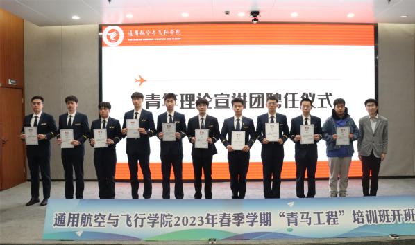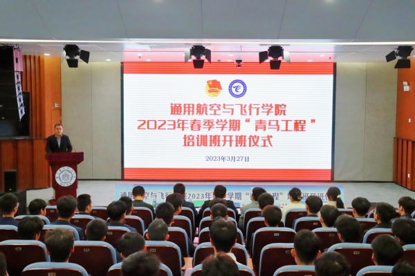 为深入学习贯彻党的二十大精神,持续推进青年马克思主义者培养工程,3月27日,通用航空与飞行学院于天目湖校区巡天楼一楼报告厅举行2023年春季学期“青马工程”培训开班仪式。校团委副书记王洋,学院党委副书记魏慧冬,学院各年级辅导员、青年理论宣讲团成员以及本期“青马工程”培训班全体学员参加活动。活动由学院学管办负责人宋歌主持。