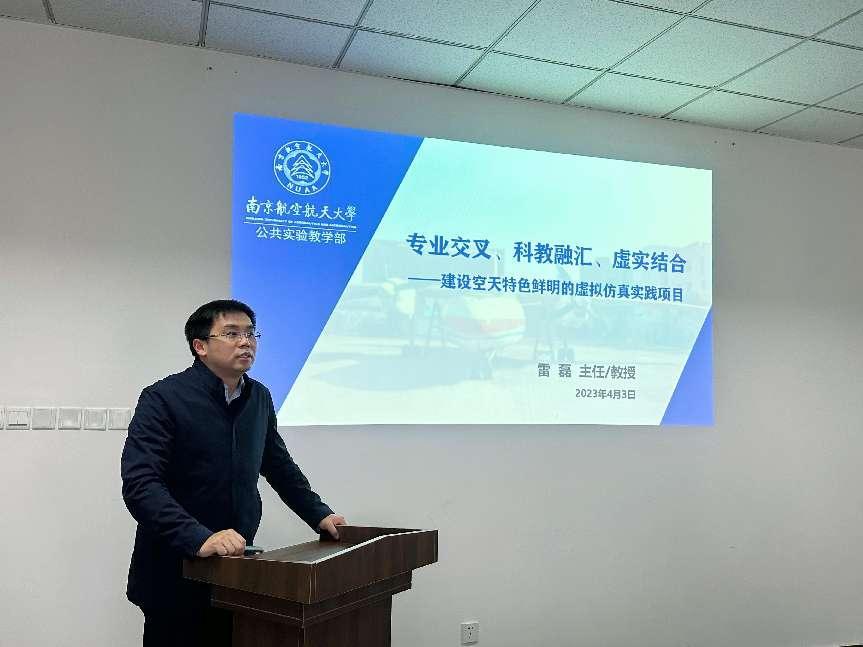 会上公共实验教学部主任雷磊汇报了虚拟仿真实践项目建设的总体思路,详细阐述了项目建设的背景、已有的建设基础和试点的建设案例。雷磊强调,新工科背景下数字化实践教学势在必行,虚拟仿真实践项目建设一定要从服务人才培养的根本点出发,以突出空天特色,体现专业交叉、科教融汇、虚实结合为理念;期待在各相关学院老师的大力支持和积极共建下,共同推动学校实践教学高质量内涵式发展。