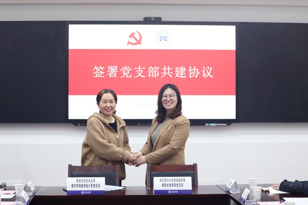 南京航空航天大学数学学院概率统计系、南京医科大学基础医学院病原生物学系签署党支部共建协议,从共筑组织建设、加强队伍建设、共育报国英才、共享科学研究等方面达成共识。