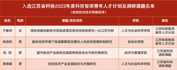 近日,江苏省科协公布了2023年度调研课题及“江苏科技智库青年人才计划”入选名单。我校人文与社会科学学院于春玲、自动化学院余自权入选“江苏科技智库青年人才计划”。经济与管理学院张钦申报课题《提升航空产业链供应链韧性和安全水平的对策研究》、人文与社会科学学院茅晓嵩申报课题《低空经济产业发展现状与对策研究》入选2023年度江苏省科协调研课题。