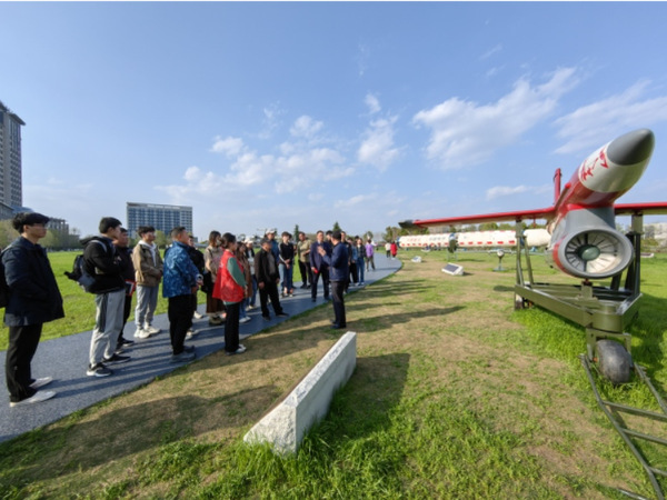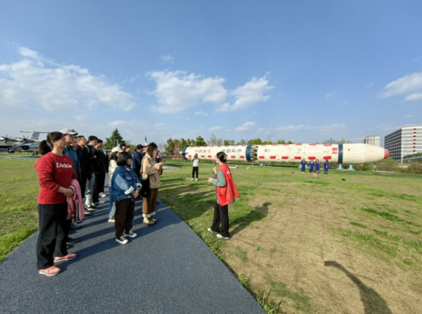 第一站师生党员们一起前往御风园,御风园是我校航空航天教育教学实践基地以及传承“红色基因蓝色梦想”的思政育人新平台。在御风园,师生们仔细聆听志愿者讲解员的耐心讲解,近距离的接触国之重器——新中国自行生产的第一型飞机初教5、歼-8Ⅱ歼击机、大型水陆两用飞机AG600、长征四号运载火箭等,沉浸式学习感受我国航空航天事业的发展成就以及学校在“为党育英才,为国筑重器”的事业上做出的重大贡献。