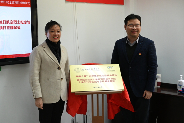 毛军逵和薛莲共同为“翱翔之翼”大学生科技志原服务基地暨南京航空航天大学能源与动力学院大学生社会实践与志愿服务基地揭牌。