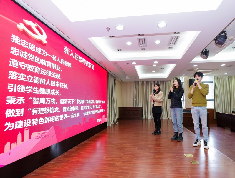 在新进教职工入职仪式上,卓迪生、张玉旋、胡晓菲三位老师在全院老师的见证下庄严宣誓:将忠诚党的教育事业,落实立德树人根本任务,秉承“智周万物,道济天下”校训和“尚德励学,筹策济世”院训,做“四有”好老师,为建设特色鲜明的世界一流大学、一流经济与管理学院而努力奋斗!