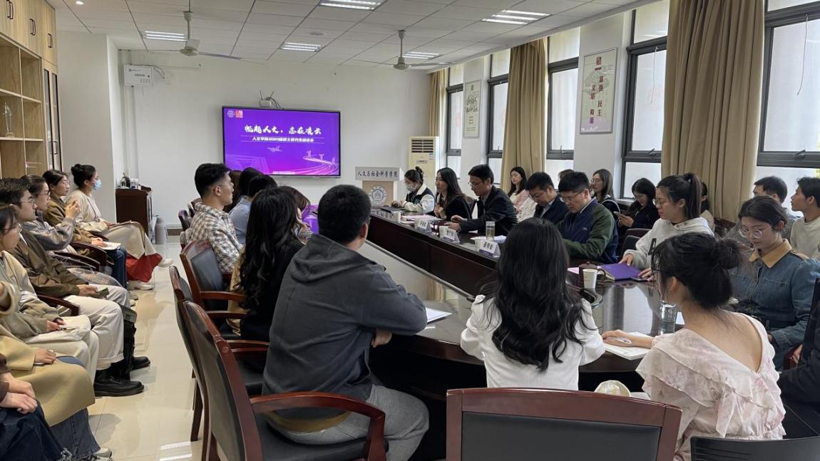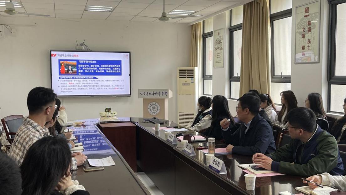 4月7日下午,人文与社会科学学院举办“帆起人文,志在凌云”2023届硕士研究生座谈会。院党委书记楚广兴、副院长茅晓嵩、院长助理聂明岩及辅导员赵燕喃、施俞辛参加了座谈会。会议由赵燕喃主持。