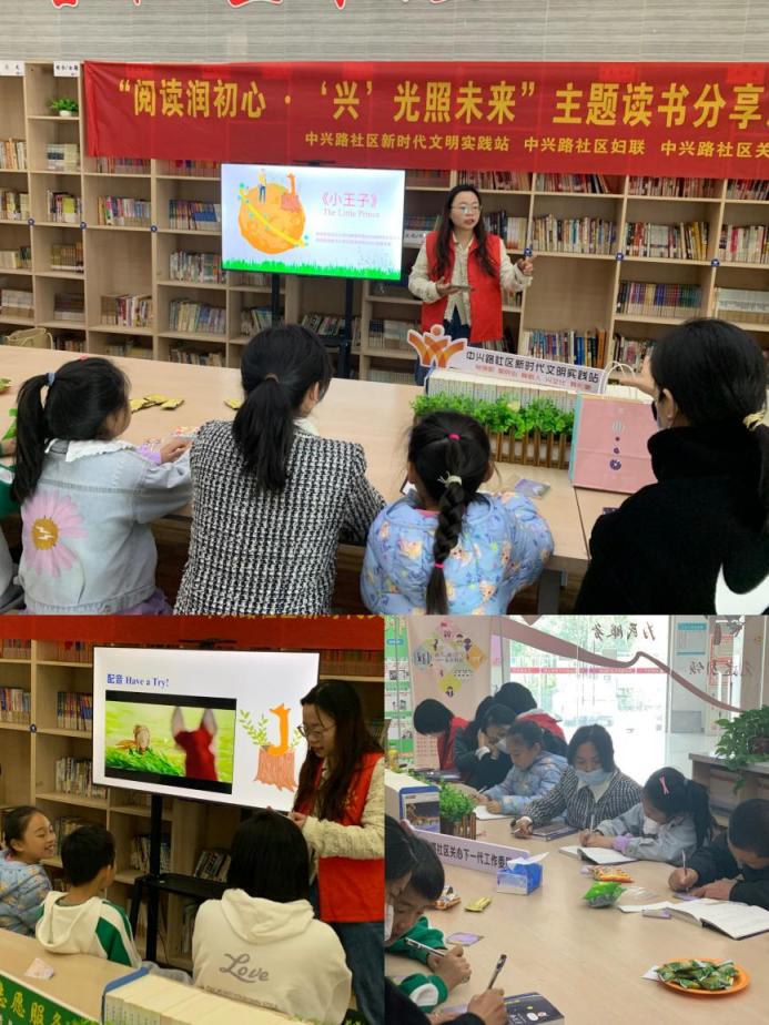 活动中,外国语学院同学、社区党员代表一同为小朋友们发放儿童经典读物《小王子》(中英双语版),向他们讲述故事主要内容,并中英文领读经典段落,大家一起就故事内容展开了热烈的讨论。过程中,现场的小朋友们积极举手参与上台朗诵,和大学生朋友们一同朗诵《小王子》精彩片段,稚嫩的童声抑扬顿挫、朗朗上口,引来阵阵掌声。随后,大家交流了阅读后心得体会,小朋友们纷纷表示阅读可以使他们在学习到知识的同时感受到快乐,从活动中明白了“开卷有益”的道理。