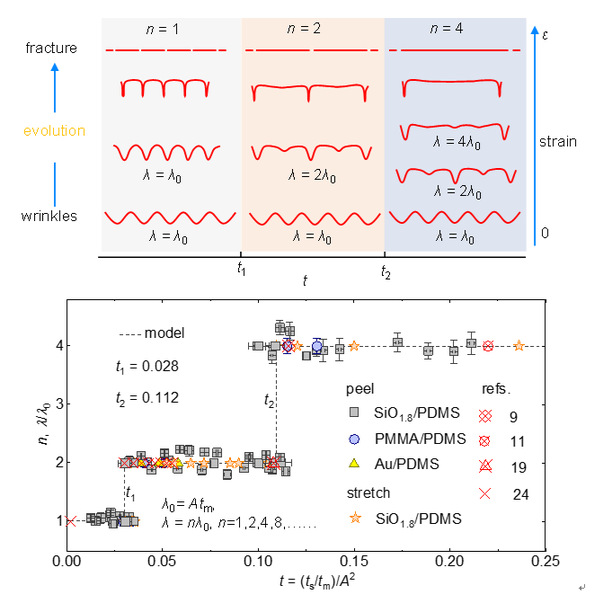 图1.软硬双层膜屈曲变形的最终失稳阶次(模态) n与软硬双层膜等效厚度比 t之间的台阶式依赖关系。上图示意最终失稳阶次分别为1,2,4时屈曲结构单元间的转化过程,下图表明标度律的普适性。