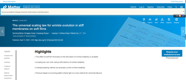 近日,郭万林院士课题组以“The universal scaling law for wrinkle evolution in stiff membranes on soft films”为题在Cell姊妹刊Matter发文报道了他们在屈曲演化领域的最新成果。论文证实双层膜的最终失稳阶次(模态)由软硬膜的等效厚度比t=(ts/tm)A-2 唯一决定。当等效厚度比的取值从t=0开始增大且不超过第一临界值t1时,屈曲演化只存在1阶失稳,最终失稳阶次为1;当等效厚度比大于第一临界值而小于第二临界值t2时,屈曲演化先后出现一阶和二阶失稳,最终失稳阶次为2。以此类推,若等效厚度比的取值在两个临界值之间,则最终失稳阶次不变;若跨越某一临界值,则最终失稳阶次增大/减小一阶,这就是屈曲演化的标度律。