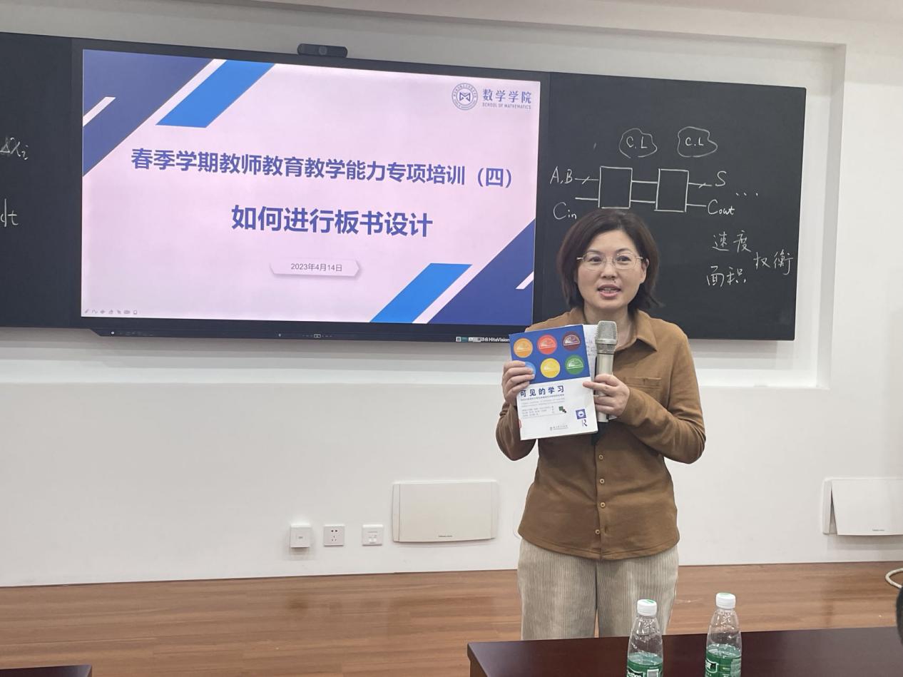 在培训讲座中,孙和军老师结合自身实例,生动富有情感地从大学数学课程教学的背景和问题、大学课堂教学设计原则和方法、教学板书的内涵和意义、数学板书的设计原则和方法等角度分析了大学数学课程的板书设计。
