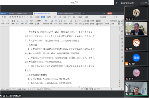 4月13日下午,外国语学院组织在线召开了2023年本科毕业论文中期检查反馈会暨论文工作推进会。学院领导、中期检查工作组的督导、系领导、教学办管理人员,指导老师和全体毕业生共100多名师生参加了会议,副院长徐以中教授主持会议。