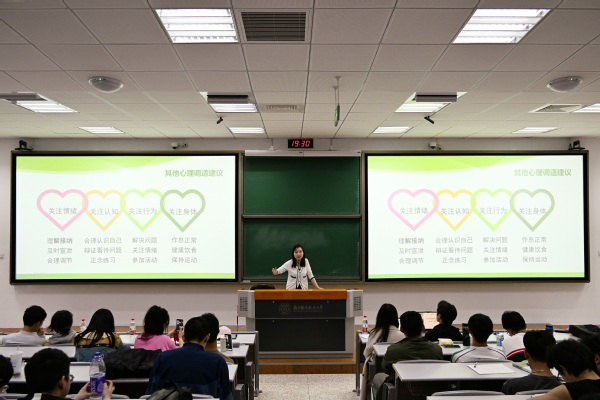 此次年级大会邀请到了校心理健康教育中心的陈瑜老师为大家做讲座,陈瑜大学生的日常行为入手,分析了大二学生的心理特点,并给出了如何进行心理调适的建议。