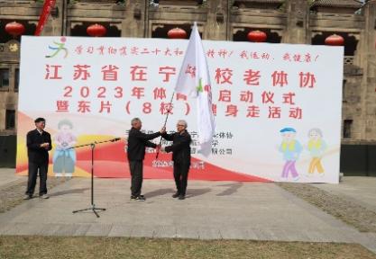 李国荣主持会旗交接仪式。他将江苏省在宁高校老年人体育协会会旗从南京航空航天大学老年人体育协会袁川耈理事长手中移交给下一年的承办单位南京农业大学老年人体育协会张剑仲理事长。