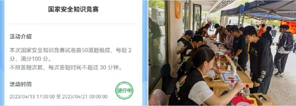 开展国家安全知识竞答比赛,普及国家安全知识,提升安全防护技能;开展“防范风险,守卫家园”国家安全知识竞答游园会,设置国家安全游园地图,通过答题、团队合作通关小游戏等方式,激发学生学习兴趣,达到以赛促学、以赛促教、以赛促效的目的;开展国家安全主题创意短视频大赛,引导学生将国家安全内化为工作生活中的点滴日常。