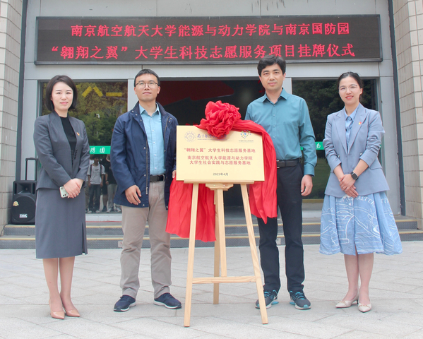 2023年4月19日,在南京国防园举行了南京航空航天大学能源与动力学院“翱翔之翼”大学生科技志愿服务国防园项目挂牌仪式,石头城遗址管理处党总支书记陈启东、第三党支部书记张莉,能源与动力学院副院长高希光、团委书记陈华华参加了揭牌仪式。此次挂牌合作不仅为南航学生学习国防知识、志愿服务社会提供了新的平台和支持,也为国防园志愿者队伍注入新的血液,是学生们厚植爱国情怀,砥砺强国之志,弘扬志愿精神的重要举措。