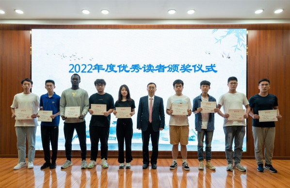 图书馆党总支书记周克印宣布了2022年度优秀读者名单,对2022年度我校图书馆“借阅达人”、在读书活动中表现突出的同学、以及从事学生助理、志愿服务的优秀同学进行表彰。姜斌为优秀读者代表颁发荣誉证书。长空学院21级本科生毛承浪作为优秀读者代表发表获奖感言。