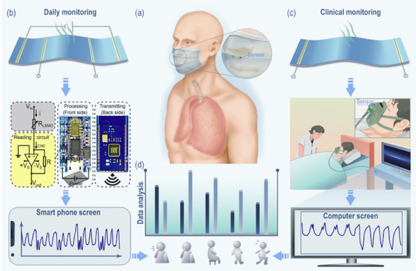 诸多可穿电子器件已被开发出来用于收集人体生理信号,在疾病预测和诊断过程中提供了有用信息。其中,肺部作为人体重要的器官,其状况可以通过呼吸参数所体现,用于呼吸监测的传感器具有重要应用意义,所获取的信息可以为个人和公共健康提供有价值的指导意见。尽管先前报道的方案可以实时监测呼吸频率,但此类传感器所需的多模态传感和对动态呼吸过程连续、长时间的监测能力,到目前为止还不成熟。