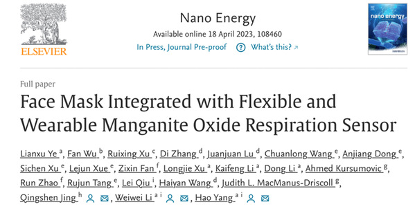 针对上述问题,南京航空航天大学李伟伟教授团队、杨浩教授团队与英国格拉斯哥大学Qingshen Jing助理教授,采用钙钛矿锰氧化物La0.7Sr0.3MnO3和氟金云母(Mica)制备了一种柔性可穿戴呼吸监测传感器,其对温度变化具有多态响应且具有优异的机械弯曲鲁棒性。在设计的两种应用场景(如图1所示)中监测人的呼吸状态,实验结果表明此柔性La0.7Sr0.3MnO3/Mica传感器在对呼吸的连续和长时间监测中表现出超强的稳定性和多模态能力。相关研究成果以“Face Mask Integrated with Flexible andWearable Manganite Oxide Respiration Sensor”为题于2023年4月18日发表在Nano Energy上。