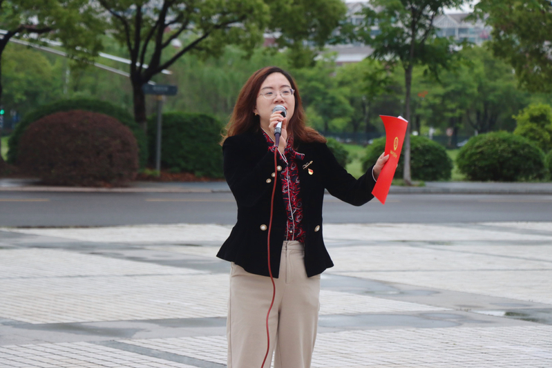 2022年度江苏省优秀学生干部张馨丹作为新党员代表在国旗下发言,她结合自身成长经历,分享了一个敢想、敢做、敢拼、敢试的青年故事;同时号召广大青年要“跟党话、跟党走”,坚定理想信念,矢志努力奋斗,永葆赤子之心。