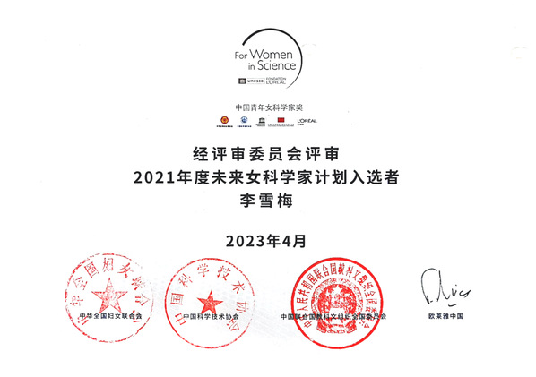 近日,由全国妇联、中国科协、中国联合国科教文组织全国委员会和欧莱雅中国共同主办的第十八届“中国青年女科学家奖”颁奖典礼在京举行。我校材料科学与技术学院李雪梅副研究员参加颁奖典礼,入选2021年度未来女科学家计划(全国共10人)。