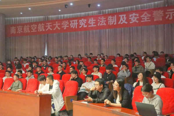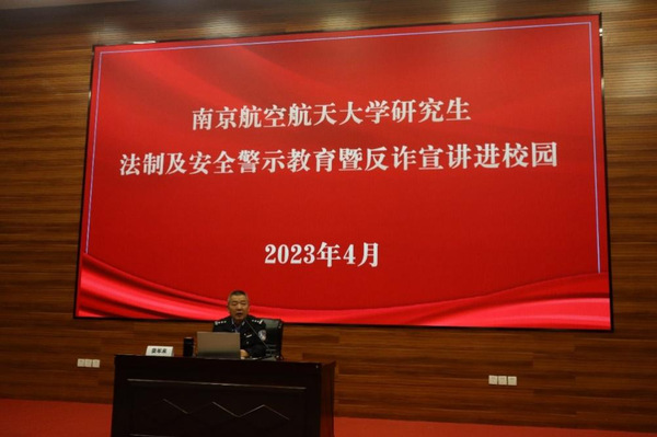 开发区派出所驻南航警务室一级警长娄军来、秦淮公安分局反诈中心警官蒋琛,分别围绕法制法规、防诈骗、网络安全等内容,从发生在研究生身边的鲜活案例出发,深入剖析大学生违反法制法规、网络安全等违法行为以及电信网络诈骗高发的原因;揭示当前电信网络诈骗隐蔽化、科技化、团伙化的特点并以图文并茂的方式详细介绍了刷单返利、冒充公检法、杀猪盘、冒充电商客服等诈骗类型;引导学生自觉成为宪法的忠实崇尚者、自觉遵守者和坚定捍卫者。