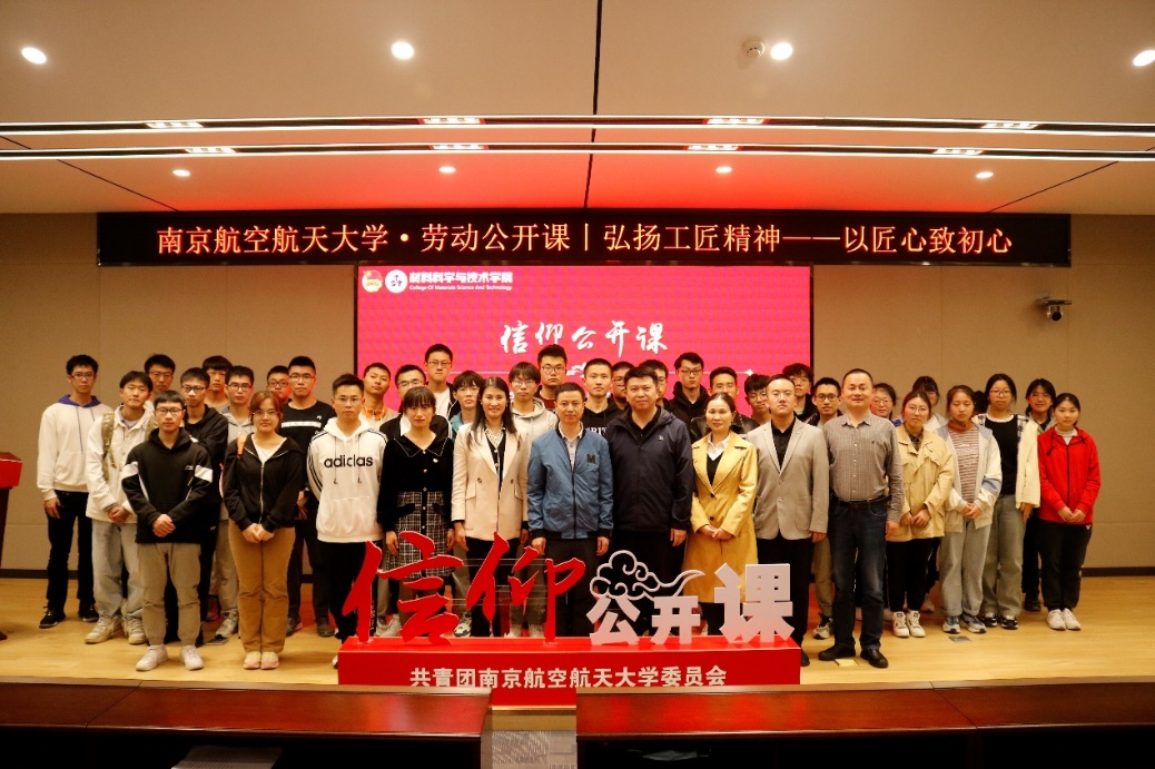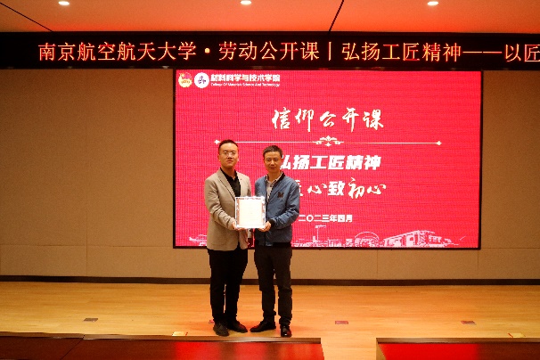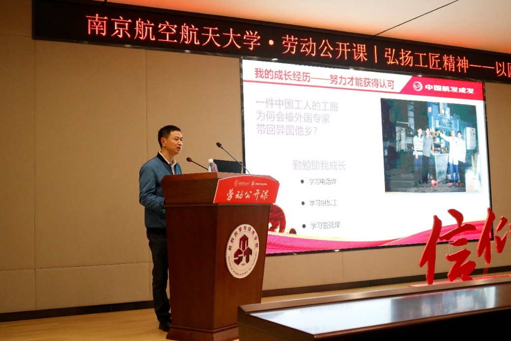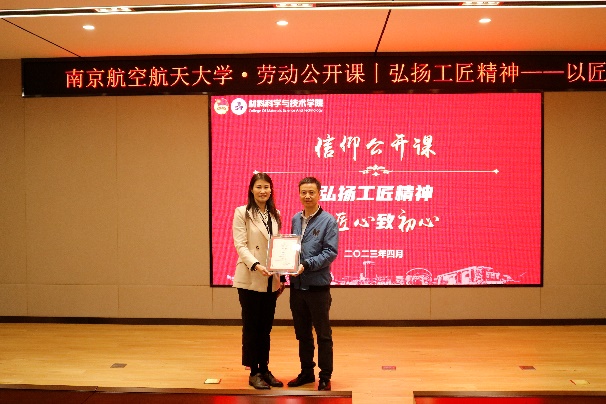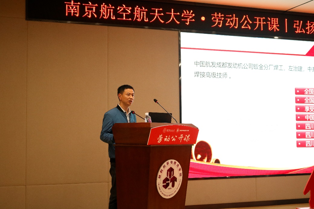 4月24日,由南京航空航天大学团委主办、材料科学与技术学院、机电学院团委团委承办的“弘扬工匠精神,以匠心致初心”信仰公开课在将军路校区材料学院报告厅举行。本次信仰公开课邀请到了中国航发成发焊接高级技师、公司首席技能专家左治建主讲,中国航发成都发动机有限公司分厂党委书记陈红颖,中国航发成都发动机有限公司人力资源部部长助理张敏,院党委副书记庄晓舒,院团委书记徐萍,机电学院2020级本科生辅导员董航及160余名学生现场参与,公开课由徐萍主持。