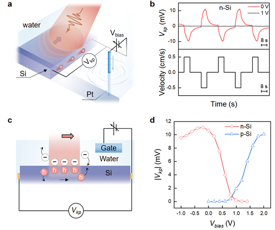 该研究团队在半导体-水界面上移动光束,发现光照-非光照区域之间双电层边界的移动能引起半导体产生面内电压(Vkp),该现象被称之为“动光伏效应”。为了有效调控动光伏效应,在铂电极(Pt)和硅(Si)之间施加电场(Vbias),其结果表明了Vkp与Vbias之间存在显著依赖关系。