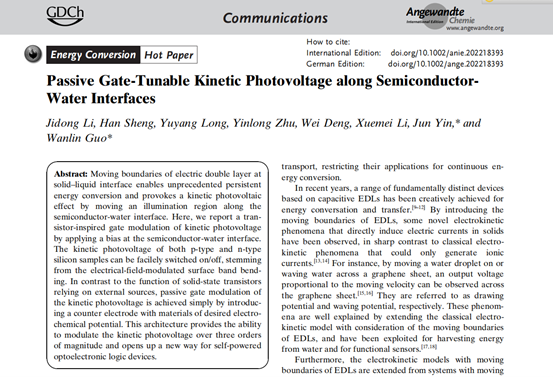 近日,前沿院团队实现了对半导体-水界面动光伏效应的类晶体管调控,该研究成果以“Passive Gate-Tunable Kinetic Photovoltage along Semiconductor-Water Interfaces”为题在线发表在Angewandte Chemie International Edition上(hot paper)。