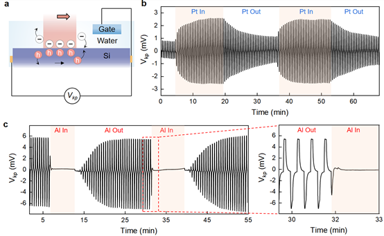 图2 (a)调控硅动光伏效应的原理示意图。(b)Pt对电极插入DI水中时n-Si的Vkp的变化(红色阴影)。(c)Al对电极插入DI水中(红色阴影)并拔出时,n-Si的Vkp的演变表明动光伏效应的开/关。