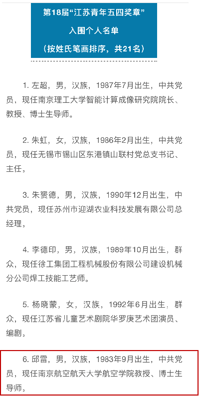 在第18届“江苏青年五四奖章”评选中,航空学院教授邱雷获评“江苏青年五四奖章”,这是我校第六次蝉联此项殊荣。江苏青年五四奖章由共青团江苏省委、江苏省青年联合会颁发,旨在选树一批政治进步、品德高尚、贡献突出的优秀青年典型,集中反映新时代江苏青年的精神品格和价值追求。