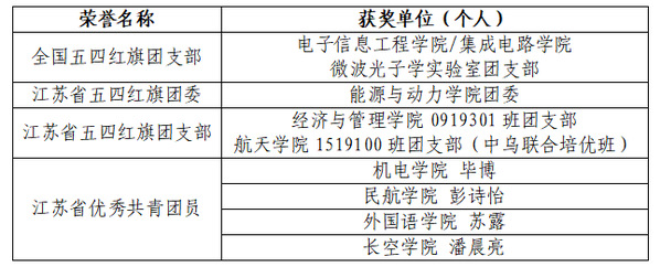 在江苏省“两红两优”表彰中,能源与动力学院团委获评2022年度“江苏省五四红旗团委”,经济与管理学院0919301班团支部、航天学院1519100班团支部(中乌联合培优班)获评2022年度“江苏省五四红旗团支部”,机电学院毕博等4人获评2022年度“江苏省优秀共青团员”。