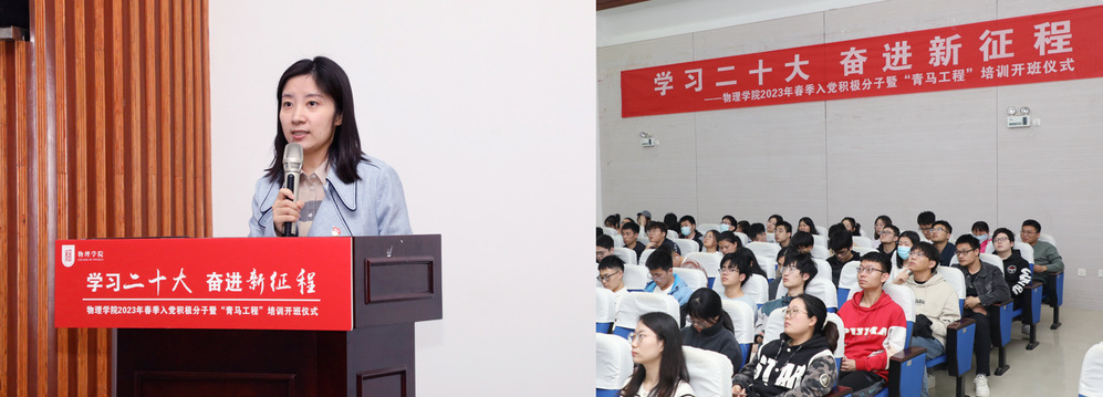 为深入学习贯彻党的二十大精神和学校第十七次党代会精神,提升入党积极分子、学生骨干教育培养质量,4月27日下午,物理学院在理学楼一楼报告厅举办2023年春季入党积极分子暨“青马工程”培训开班仪式。学院党委副书记欧珊、组织员张喆、团委书记梁欢、全体学生辅导员参加。活动邀请了学校学习贯彻党的二十大精神宣讲团成员、人文与社会科学学院教授王文军开展专题培训。