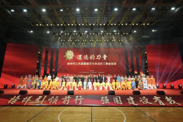 戏曲联唱《榜样的力量》为巡演拉开序幕。京剧、淮剧、昆剧、扬剧、锡剧五个剧种融合,颂扬助人为乐、见义勇为、诚实守信、敬业奉献、孝老爱亲的高尚品格;情景讲述《点亮爱心》讲述了全国道德模范周维忠,用“可以享受国家用电减免政策”的爱心“谎言”,帮扶困难家庭,为村民送去光和热的故事;音乐快板《孝老爱亲一脉传》讲述了中国好人张景宏、殷志兰悉心抚养五个侄儿侄女、尽心赡养八个“爹妈”的无私大爱;故事讲述《带着奶奶上大学》生动呈现了中国好人严慧大学期间用心照顾奶奶的感人故事。情景诗画《坚守》讲述了新四军刘老庄连指导员李云鹏烈士的妹妹李爱云终身守誓的感人故事;清曲说唱《土地情深》生动呈现了全国道德模范赵亚夫61年如一日带领农民脱贫致富,徒弟糜林燃尽生命之光照亮富民路。故事讲述《巷子里的磨刀声》将全国道德模范提名奖获得者、95岁高龄的磨刀老人吴锦泉多年省吃俭用,把磨刀挣得的微薄收入用于慈善公益的故事呈现在观众面前;情景短剧《守护者》呈现了白衣为甲、逆行出征的感人事迹,生动诠释全国道德模范、江苏“时代楷模”邱海波敬佑生命、救死扶伤的精神;我校大学生艺术团现场表演舞蹈《逐梦云天外》,展示了一代代国之重器铸造者为祖国航空航天事业奋勇拼搏、无畏付出的感人精神,节目曾获教育部第五届全国大学生艺术展演舞蹈比赛一等奖;朗诵《追寻》讲述了一心为国铸盾的防护工程专家钱七虎,勇攀科技高峰的深海“奋斗者”叶聪的追梦故事;演出在歌舞《在道德星空下前行》中落下帷幕。