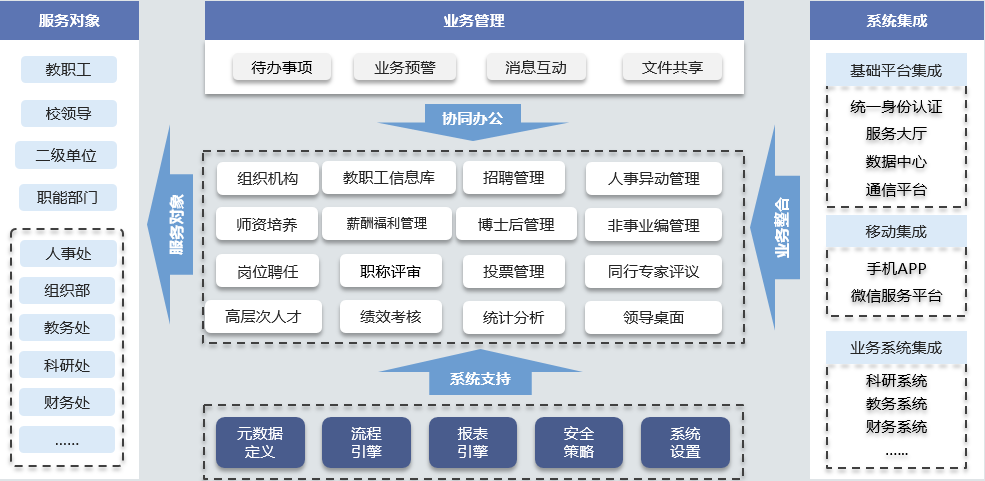 基于全过程管理理念,人事处在“数字人事”一期建设中精心设计了教职工招聘、入职报到、住房补贴、科研启动金发放、职称评审、年度考核等业务的线上流程,实现了不同类别人员、不同业务模块的网络化、流程化管理。