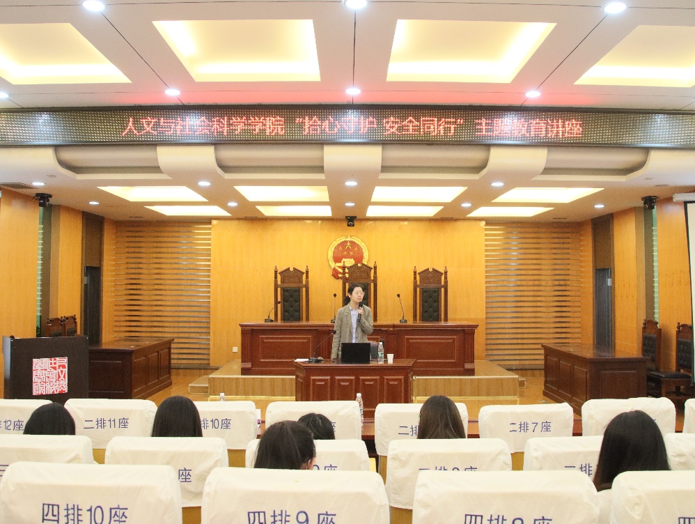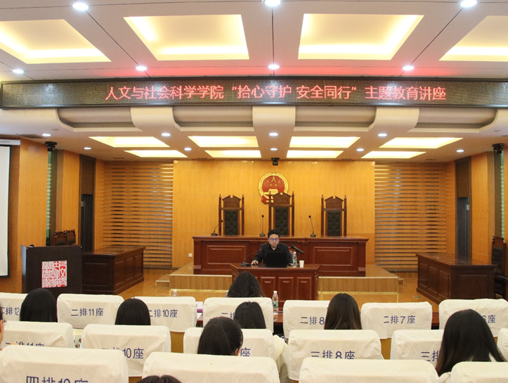 5月11日晚,人文与社会科学学院在模拟法庭开展 “拾心守护,安全同行”专题讲座,邀请保卫处治安管理科科长黄超峰、人文与社会科学学院公共管理系教师王媛担任主讲嘉宾,各年级学生干部、寝室长参加了讲座。