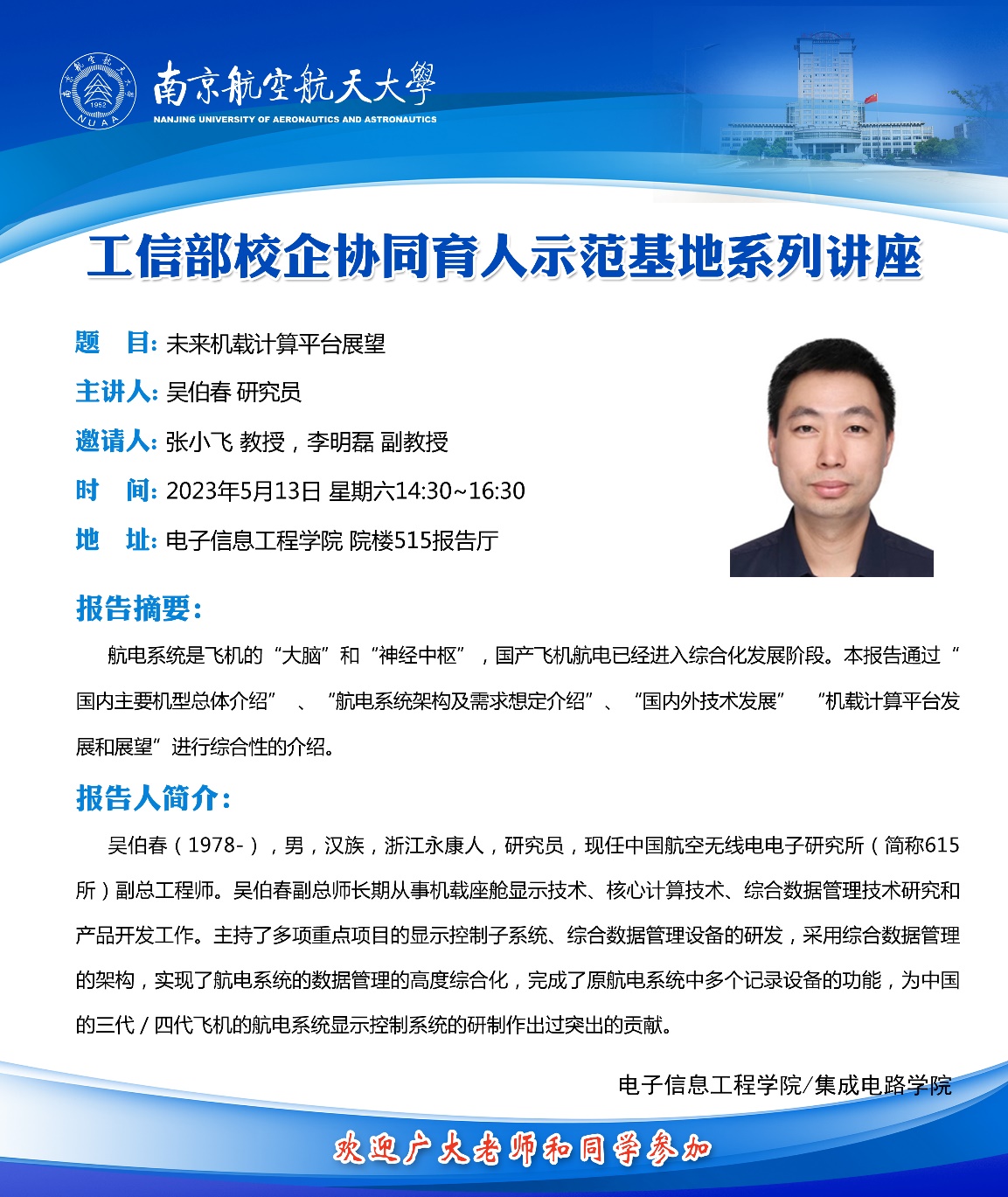 2023年5月13日,中国航空无线电电子研究所(简称615所)吴伯春研究员受邀来我校电子信息工程学院/集成电路学院做题为“未来机载计算平台展望”的专题讲座。