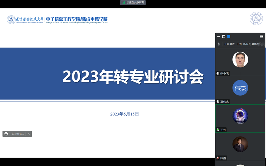 2023年5月15日,电子信息工程学院/集成电路学院召开本科生优秀生类转专业工作研讨会。会议由副院长张小飞主持,院长助理夏伟杰、系副主任王毅、陈鑫、晋本周、教务员胡欣怡参加了此次会议。