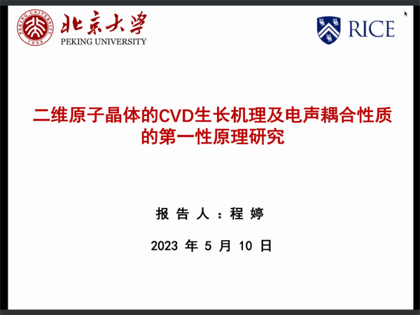 随后,青年学者分别围绕 Investigation on quantum resources and their applications、二维原子晶体材料的CVD生长机理及电声耦合性质的第一性原理研究、基于射频原子磁强计的电磁感应成像、基于光纤光栅智能传感器的飞行器结构健康监测技术、钙钛矿薄膜微结构调控与光电器件研究、基于中子衍射技术对铁基超导材料BaFe2Se3的磁结构研、Photoresponsivepolar LuMnO3 and nonpolar LaFeO3 oxides innon-centrosymmetric structures进行了学术报告,线上线下同步参与的专家学者们就报告内容进行了深入探讨与交流。