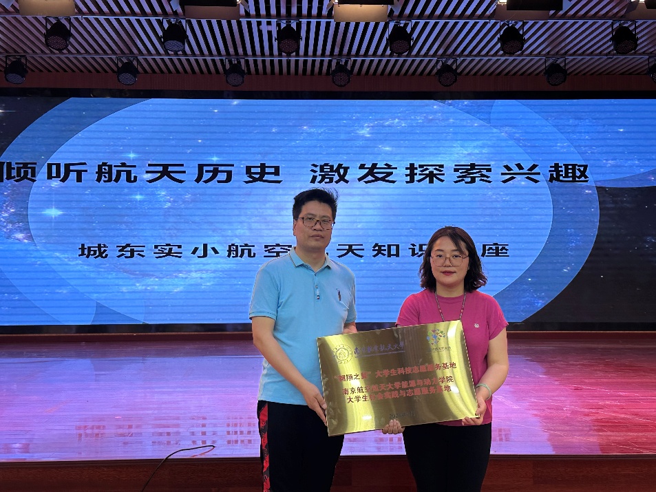 5月15日,能源与动力学院走进徐州市城东实验小学开展“翱翔之翼”科技志愿服务活动,举行项目基地挂牌仪式,向小学生宣讲科学家精神,科普航空航天知识。城东实验小学副校长樊茜、副校长杨成盾,徐州鼎科文化传播有限公司董事长王正辉,南航能源与动力学院党委副书记樊小杰、学院“翱翔之翼”科技志愿服务团队成员参与此次活动。