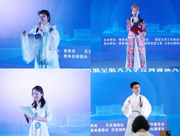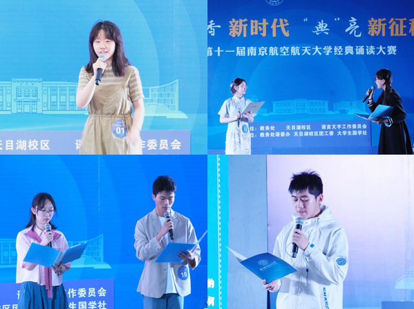 为弘扬中华优秀语言文化,从中华经典中汲取智慧力量、坚定理想信念,彰显时代精神,展现当代青年人对中华经典的传承与创新。5月20日晚,由教务处、天目湖校区、校语言文字工作委员会主办的南京航空航天大学第十一届经典诵读大赛在天目湖校区举行。国家级普通话测试员周敏燕、天目湖校区团工委书记肖杰、常州祺说文化传媒有限公司总经理,溧阳团市委社会联络部副部长蒋琪担任本次大赛评委。